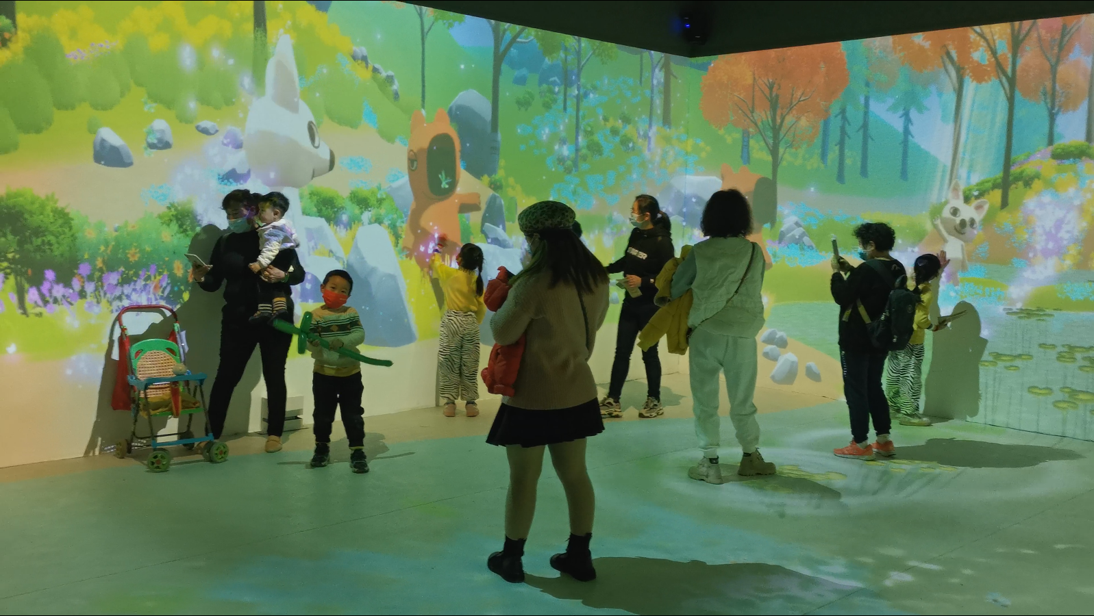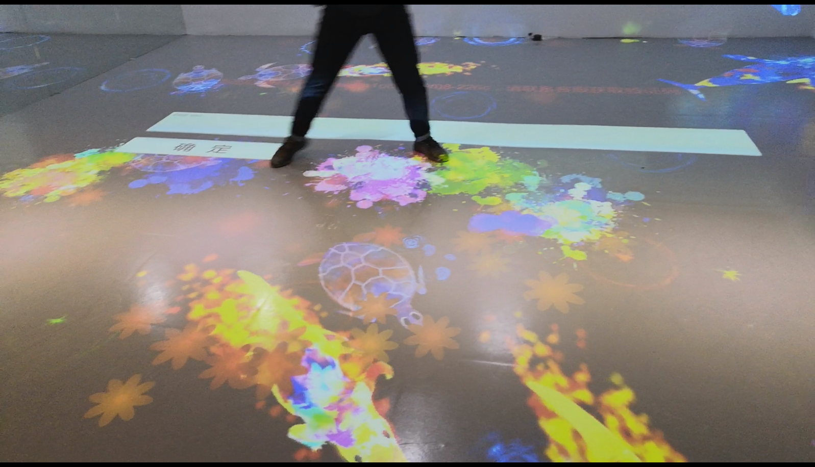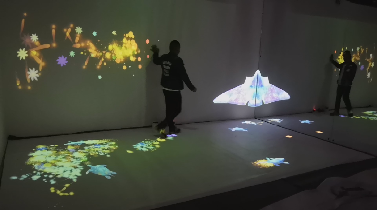 此场景为1200平超大雷达交互场景,此图为游客在投影场景中与程序内容进行互动