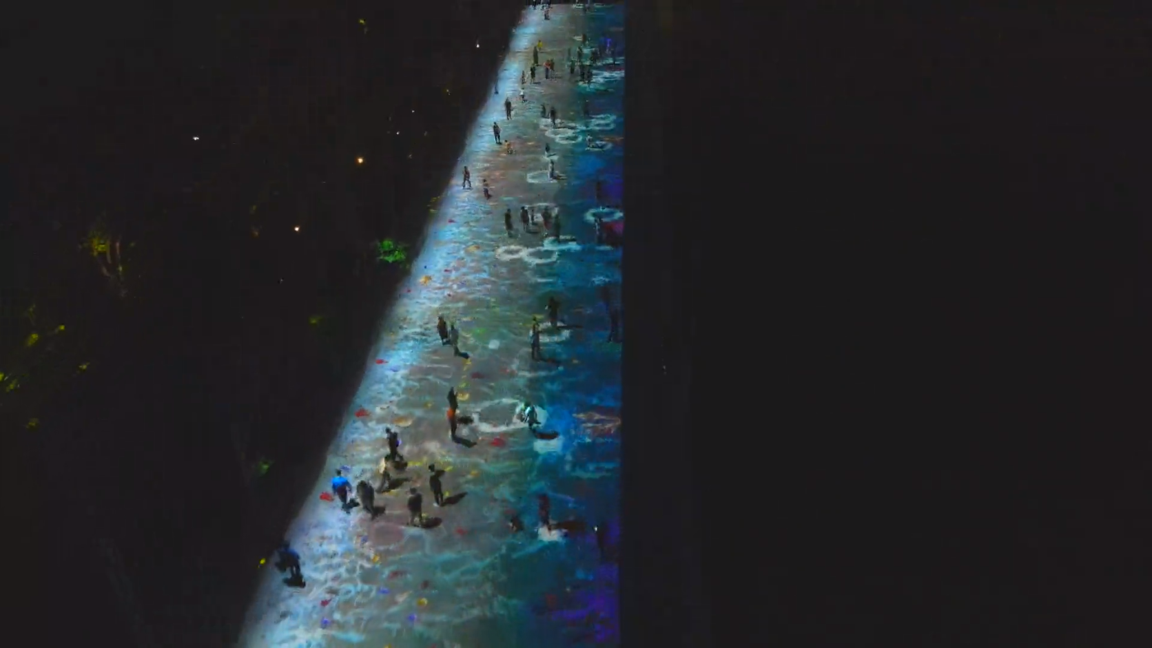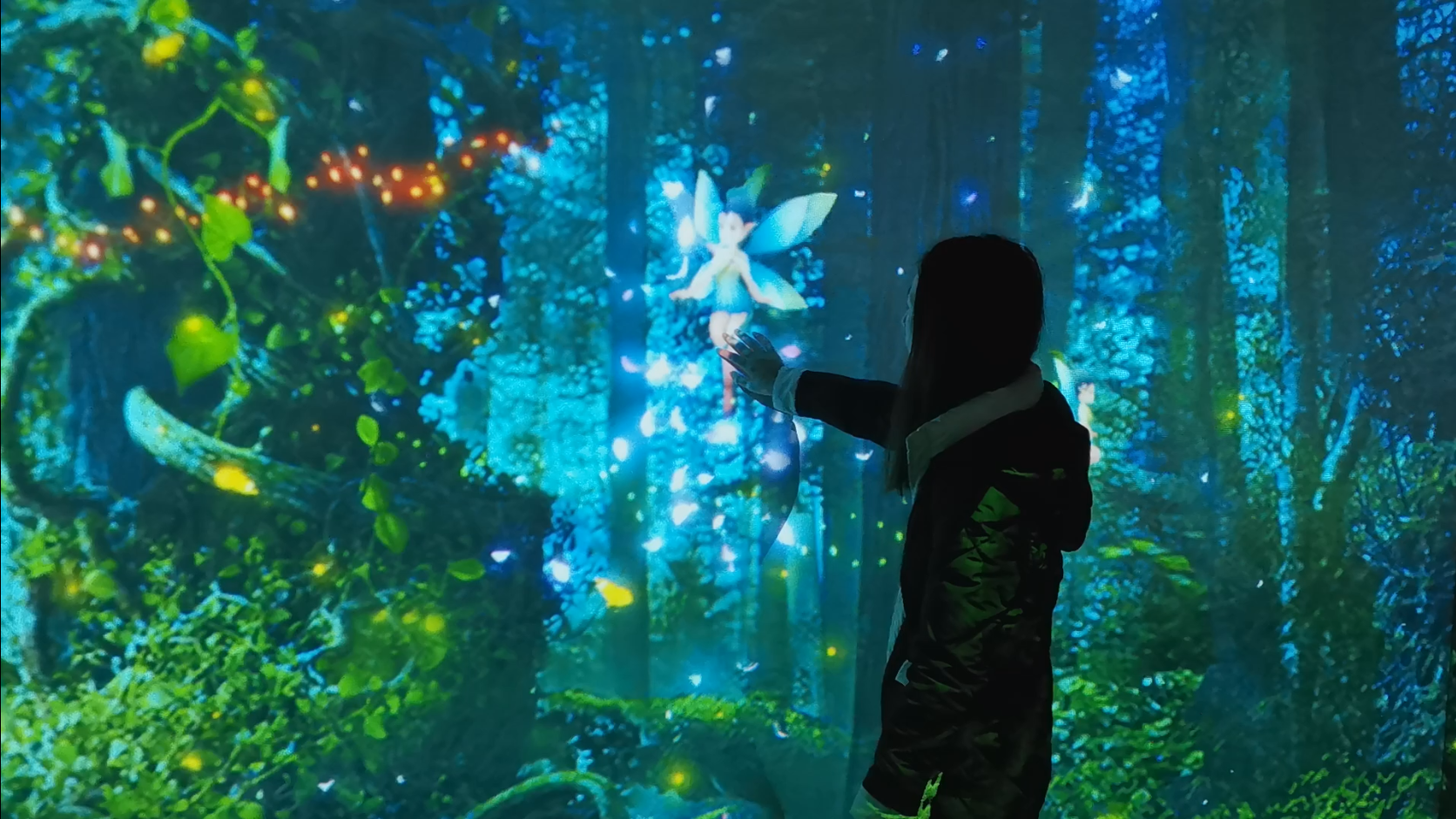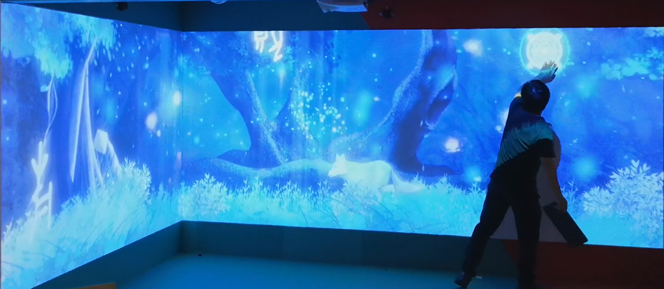 此场景为1200平超大雷达交互场景,此图为游客在投影场景中与程序内容进行互动