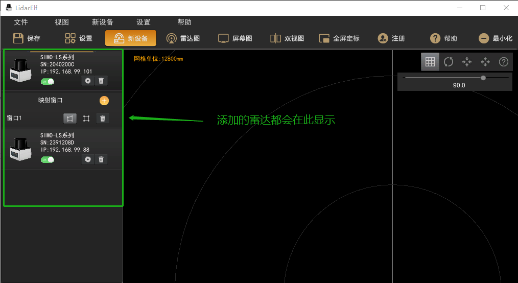 点击新设备,按照IP地址依次添加多颗雷达,添加之后设备列表会显示多颗雷达,如图所示: