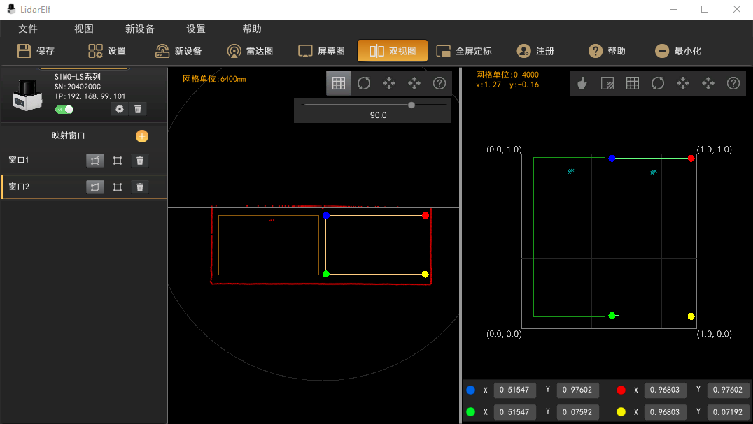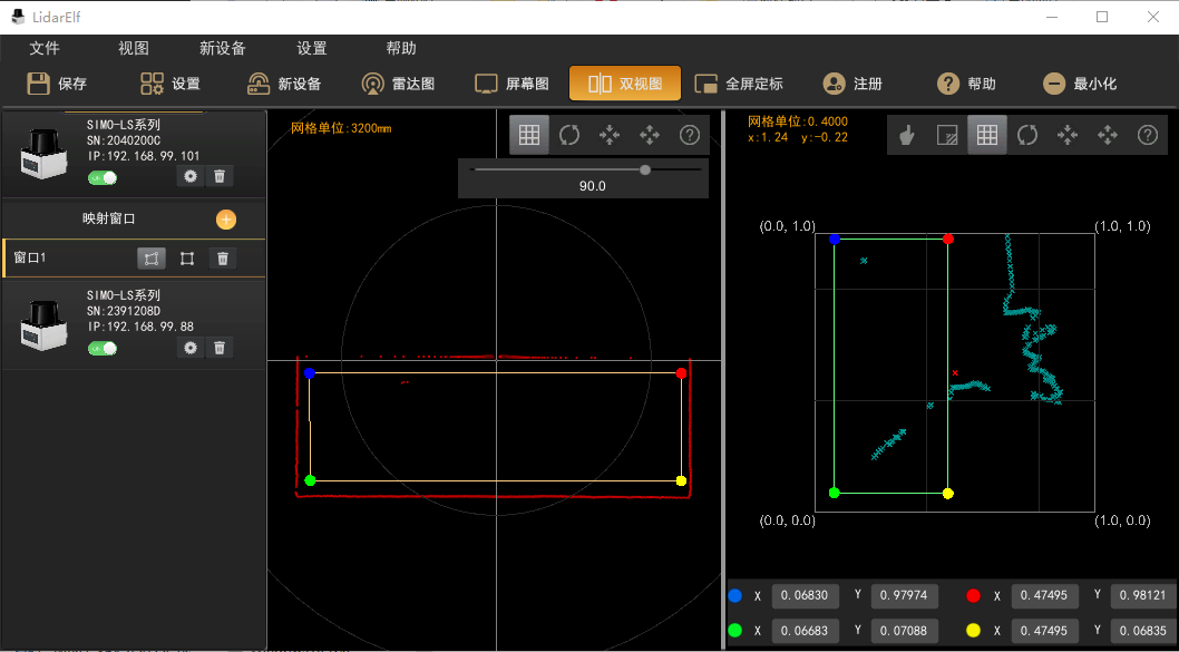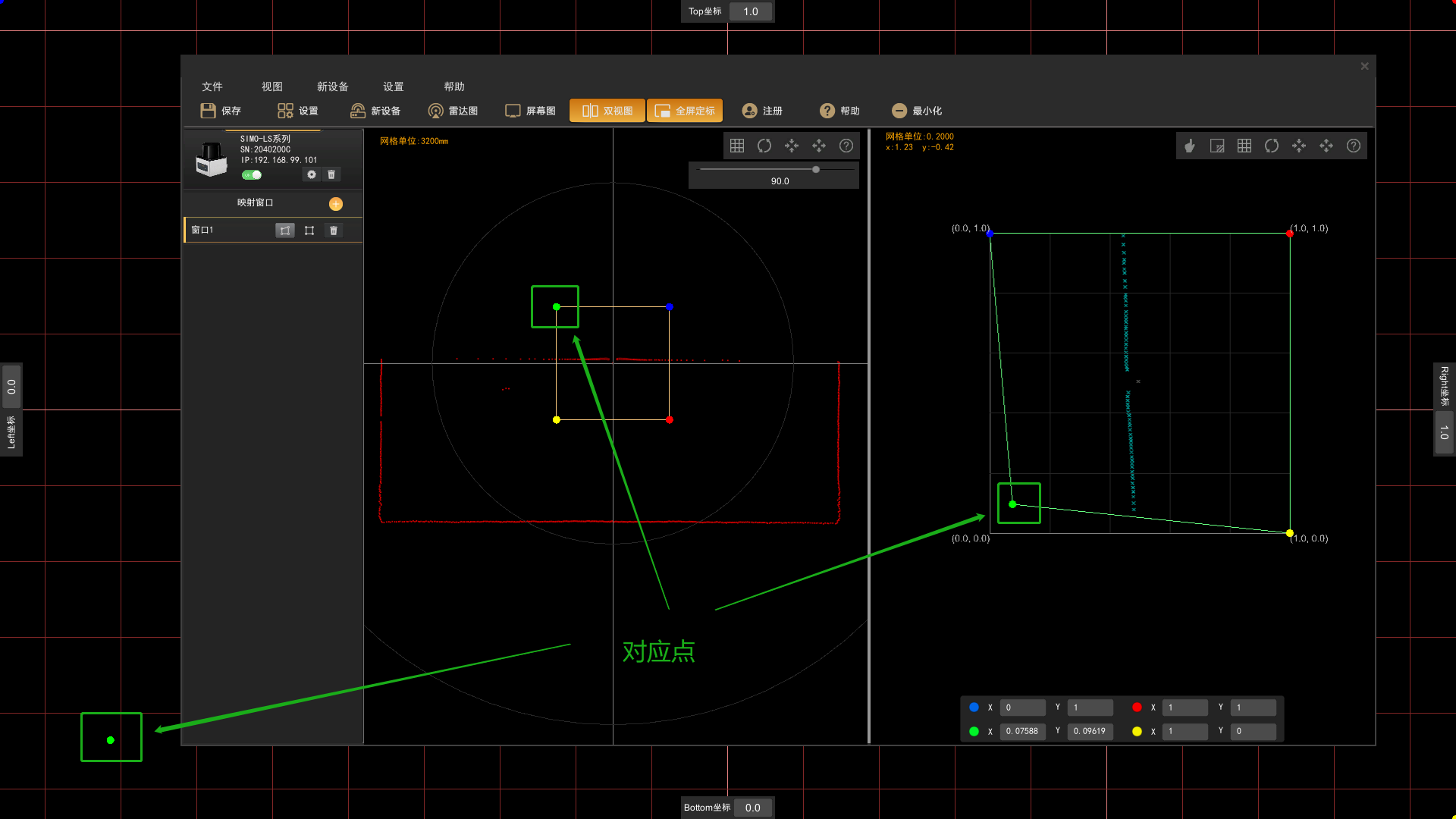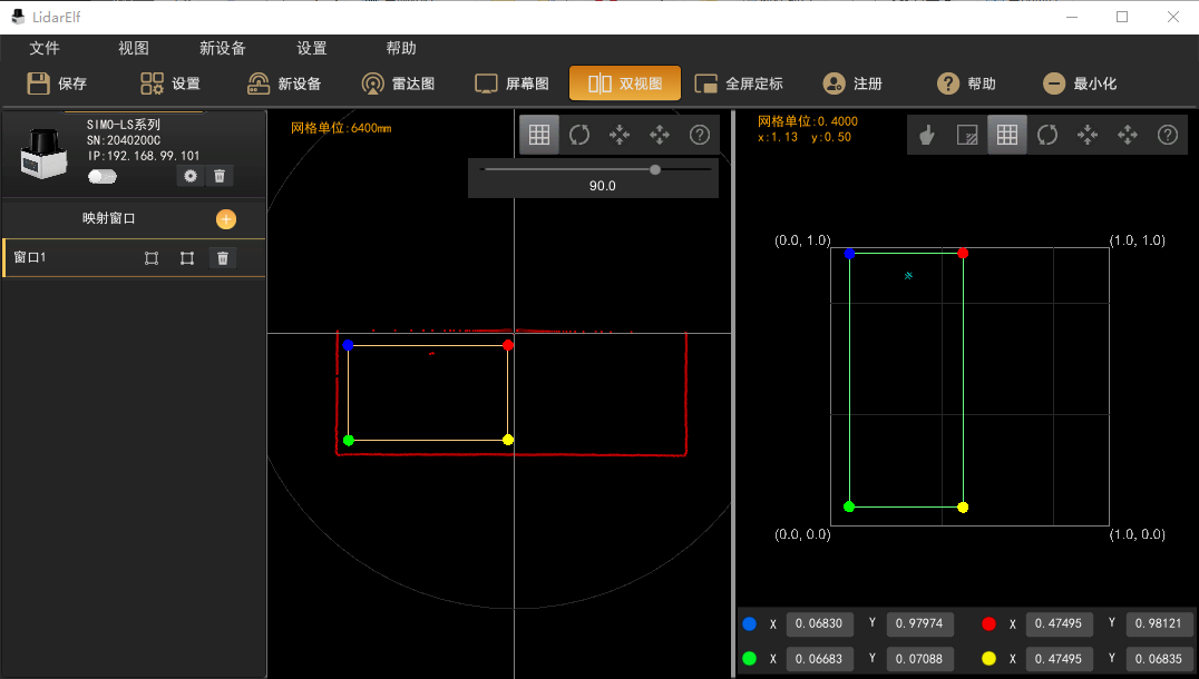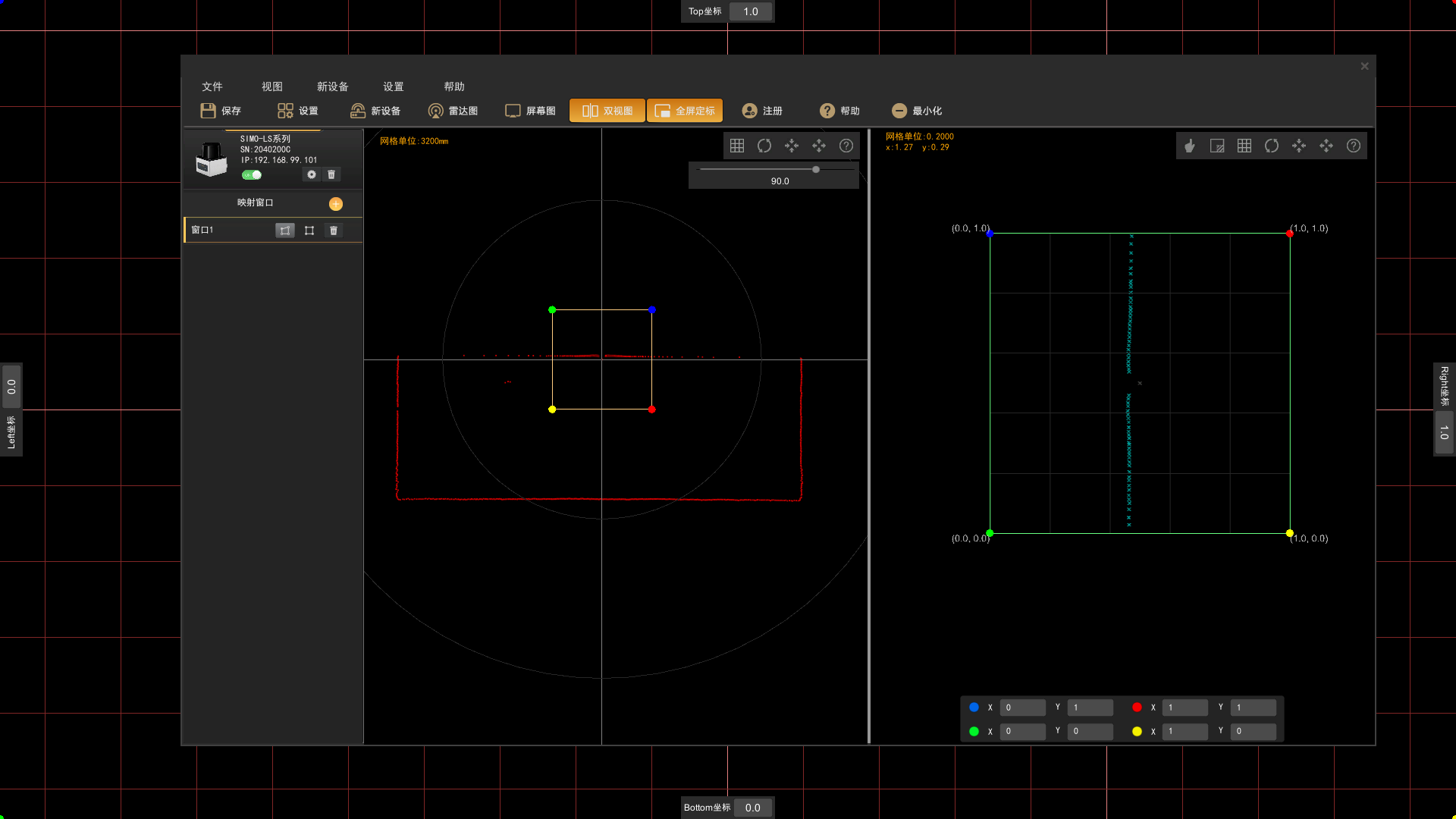 点击双视图,选中左侧设备列表中的雷达设备,点击雷达下面的添加映射窗口按钮,选中刚添加的窗口,此时在雷达图和屏幕图上都可看到绿、蓝、红、橙四个顶点,如图所示:
