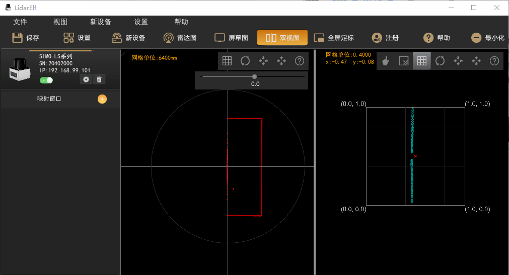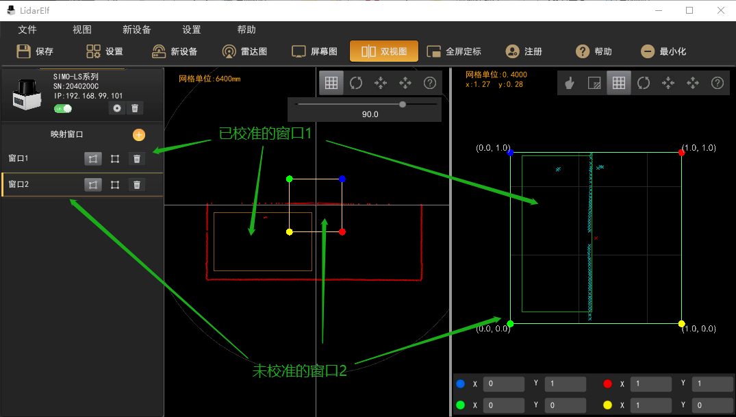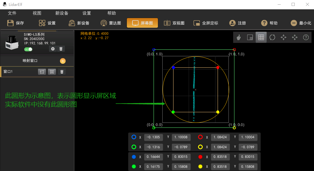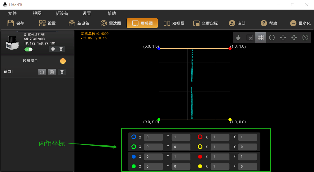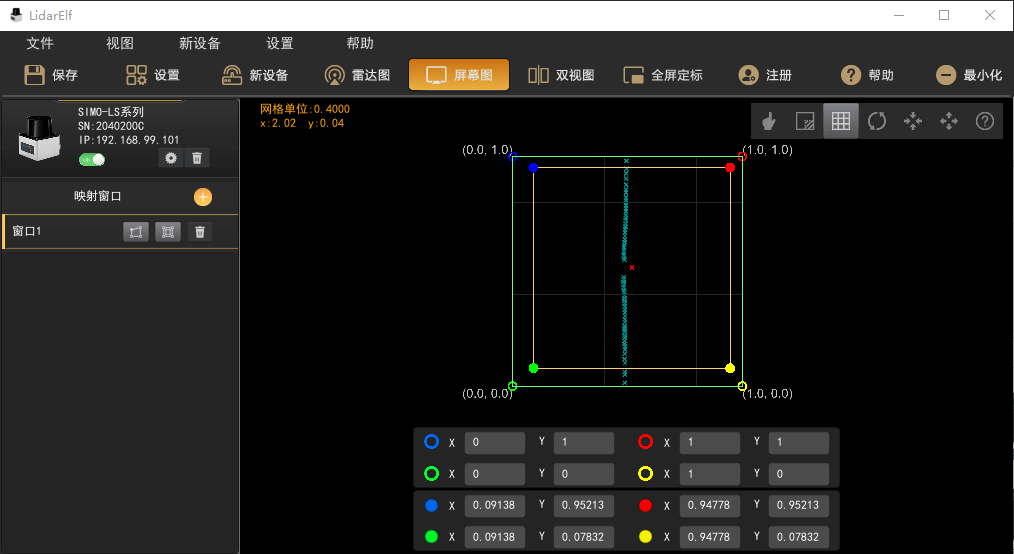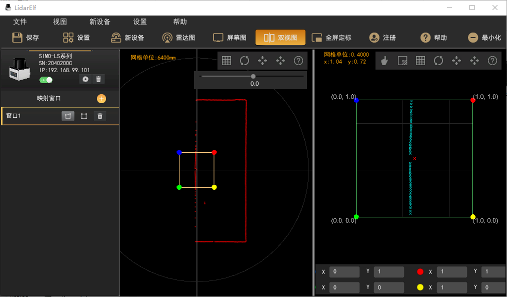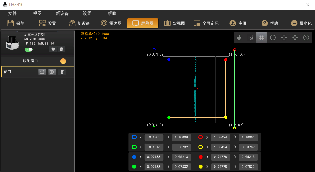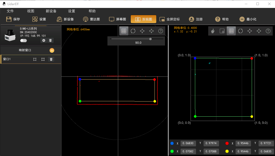 点击双视图,选中左侧设备列表中的雷达设备,点击雷达下面的添加映射窗口按钮,选中刚添加的窗口,此时在雷达图和屏幕图上都可看到绿、蓝、红、橙四个顶点,如图所示:
