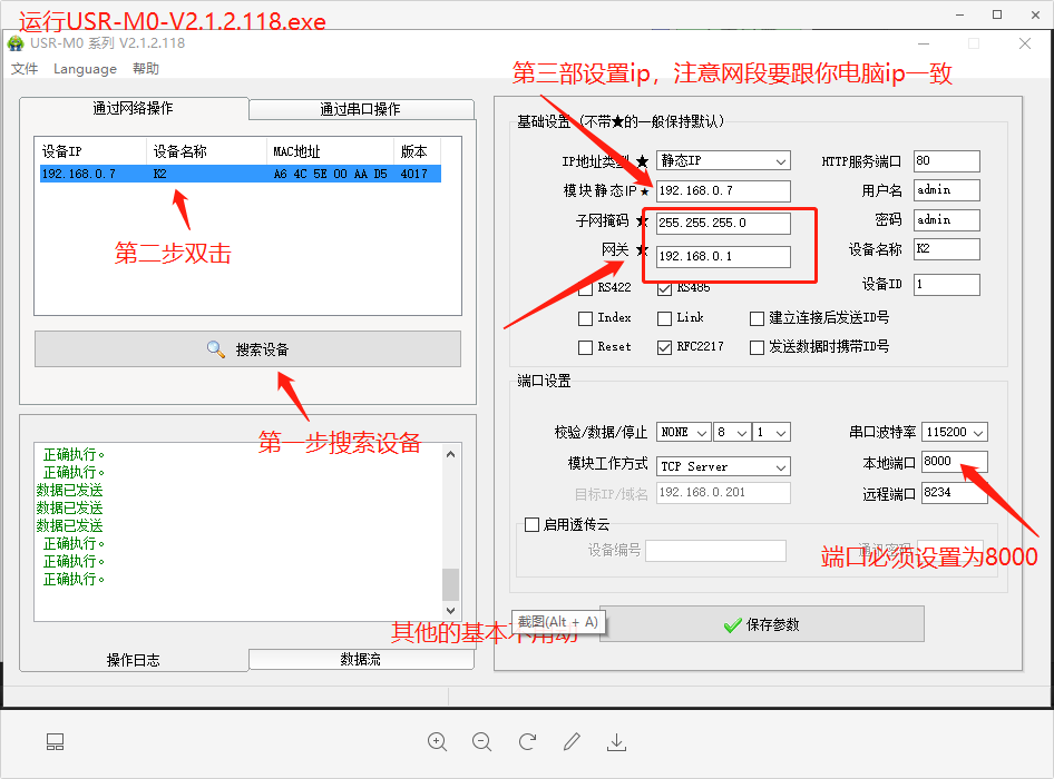 打开USR-M0-V2.1.2.118程序查看并修改,如下图所示: