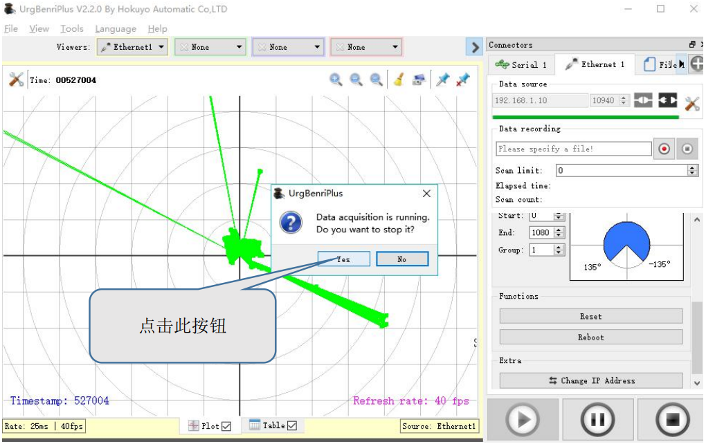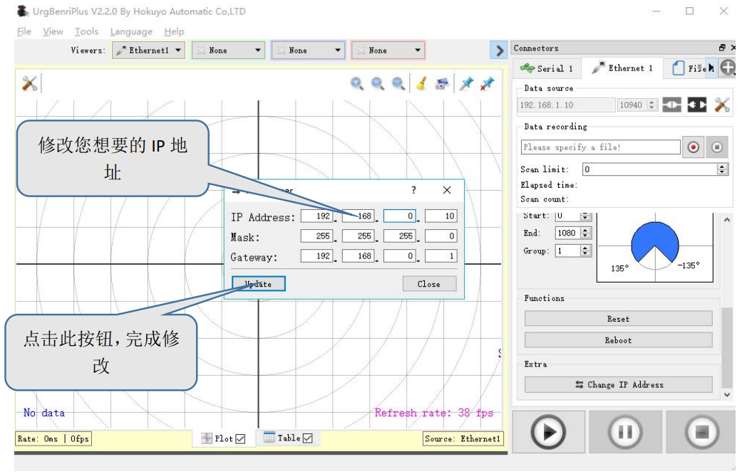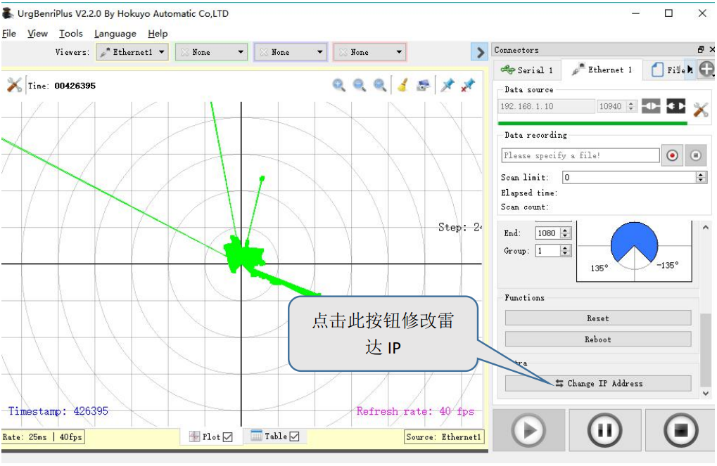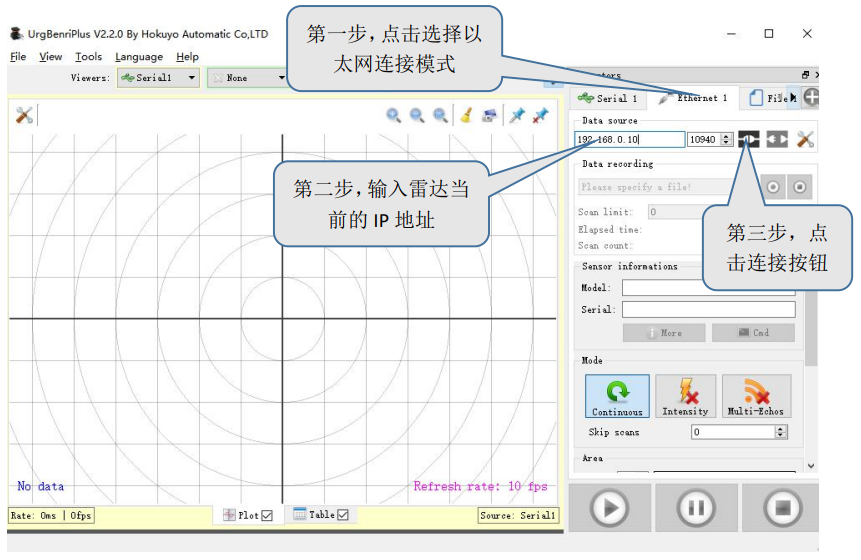 北阳雷达默认IP为192.168.0.10,可用工具包中的UrgBenriPlus_2.2.0.exe程序查看并修改雷达IP;