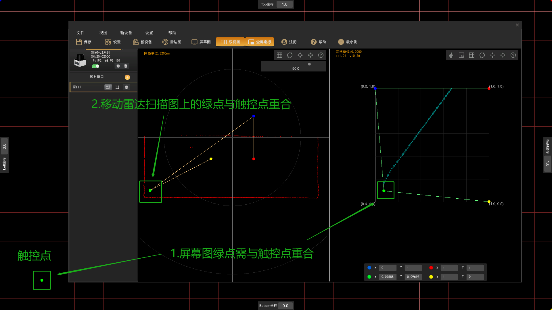 在投影区域上选择4个触控点(尽可能多的覆盖投影显示区域),并移动屏幕图上对应的顶点到触控点,如触控点在投影区域左下角位置,移动屏幕图上的绿点到触控点并与之重合,此时投影区域绿点即为触控点,观察触控点在雷达扫描图上的位置,并拖动雷达图上的绿点到触控点并与之重合,此时左下角绿点校准完毕,如图所示: