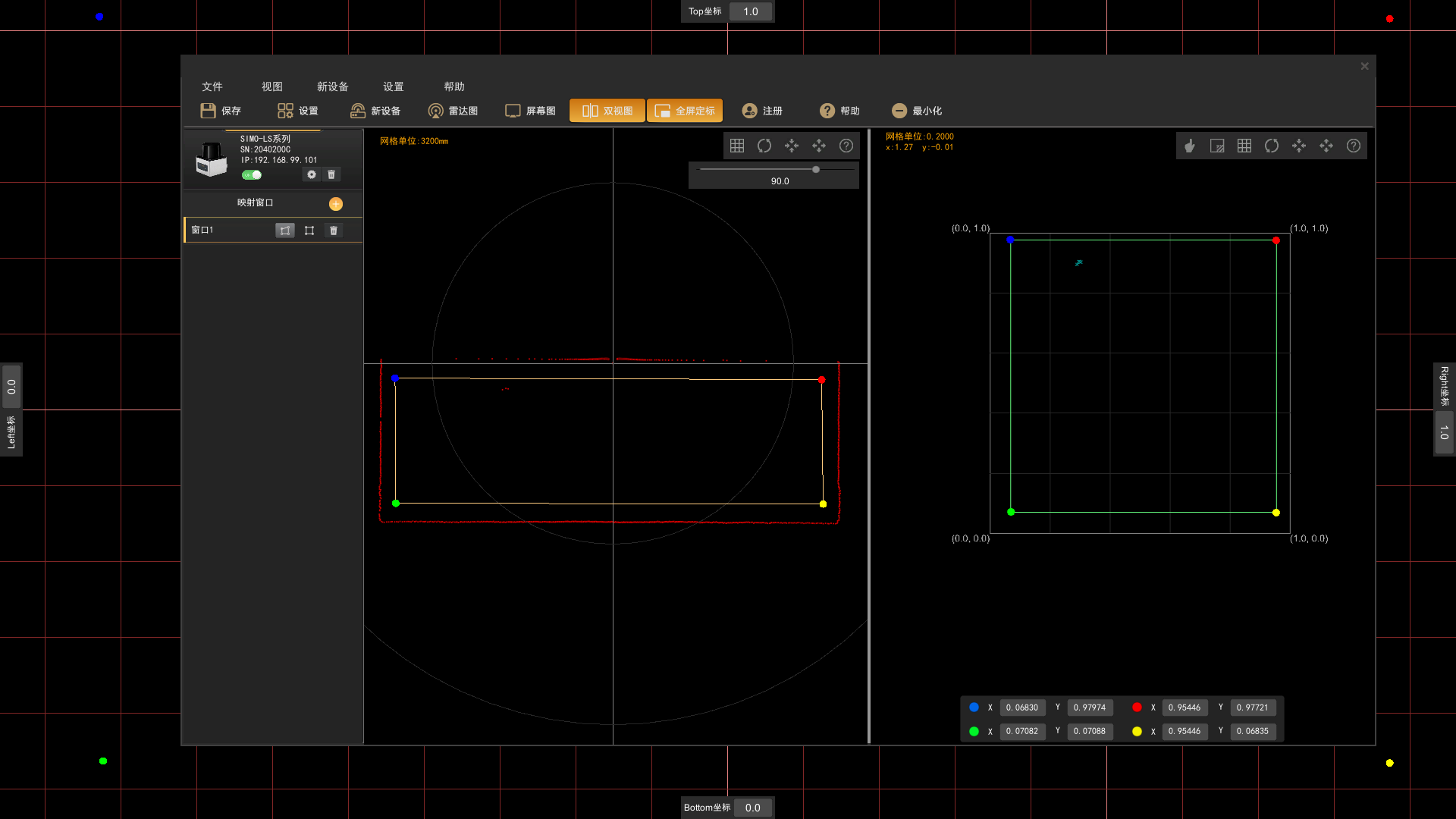 点击全屏定标按钮,此时网格会铺满整个投影区域(即程序画面显示区域,包括LED显示区域等,以下用投影区域替代),绿、蓝、红、橙四个顶点分别在投影区域的四角,(雷达图可以旋转方向,便于对照),如图所示: