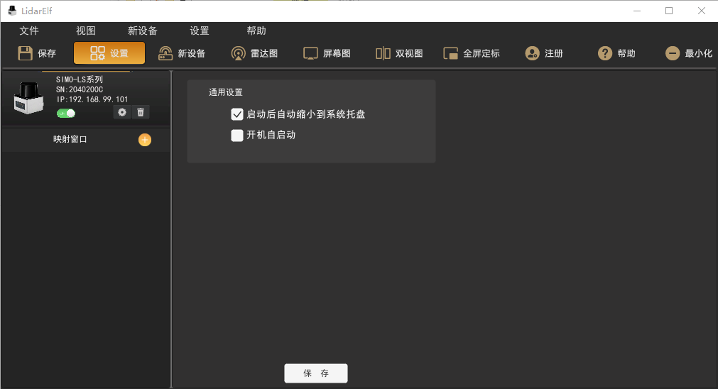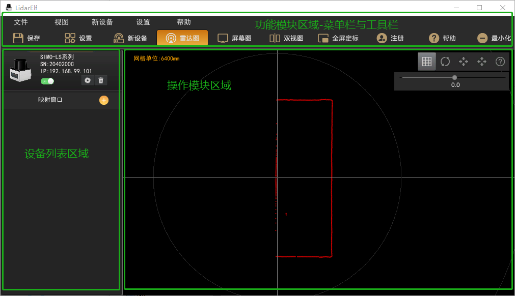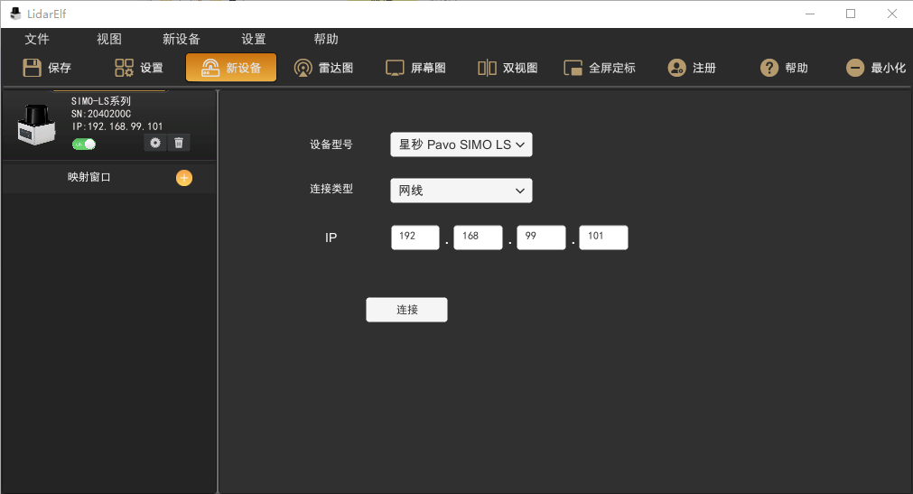 用来添加雷达设备,输入雷达的局域网IP后点击连接即可,如图所示: