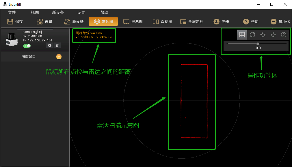 雷达图中左上角为空间信息,中间为雷达扫描示意图,右上角是操作功能区,有上下两排,上排第一个按钮为雷达扫描图网格的显示/隐藏按钮,第二个按钮为还原视图位置,第三和第四个按钮分别为缩小视图、放大视图按钮,最后一个为帮助按钮;下排滑动条可以调节雷达扫描图的旋转角度。