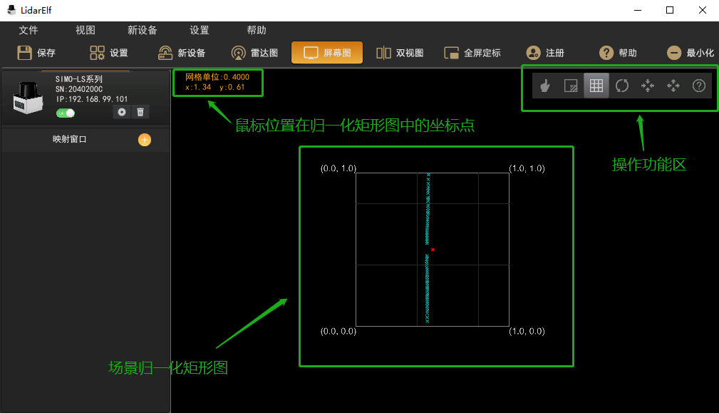 本软件为展陈、演出、工程运用中利用2D激光光学雷达进行信号测量、人机交互的场景提供了方便高效的多路集联、校准、信息反馈等解决方案。