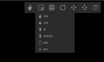 第一个按钮为触控类型选择按钮,有以下几种触控类型:手指、手部、脚、身体站位、鼠标及默认,主要区别在于触控面的大小不同,如下图所示;
