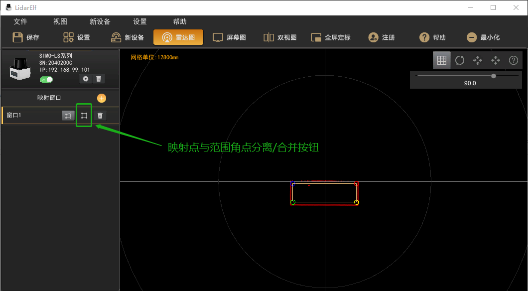选择设备列表中雷达的校准窗口,选中映射点与范围角点分离/合并按钮,如图所示: