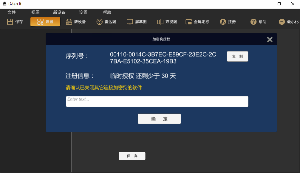 注册:软件有配套的加密狗,插上加密狗后,点击注册按钮会弹出注册页面,复制注册码并发送后会得到一串验证码,输入验证码即可注册成功,如下图所示: